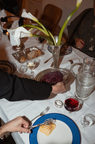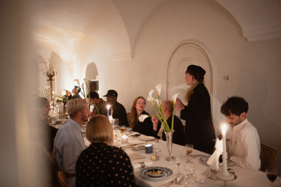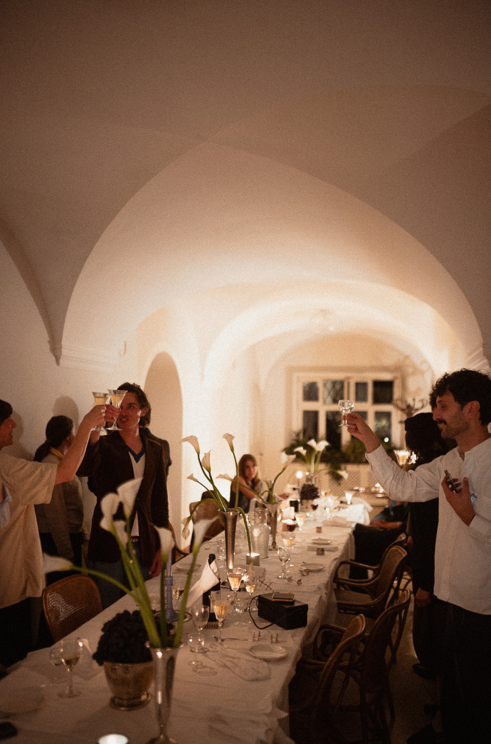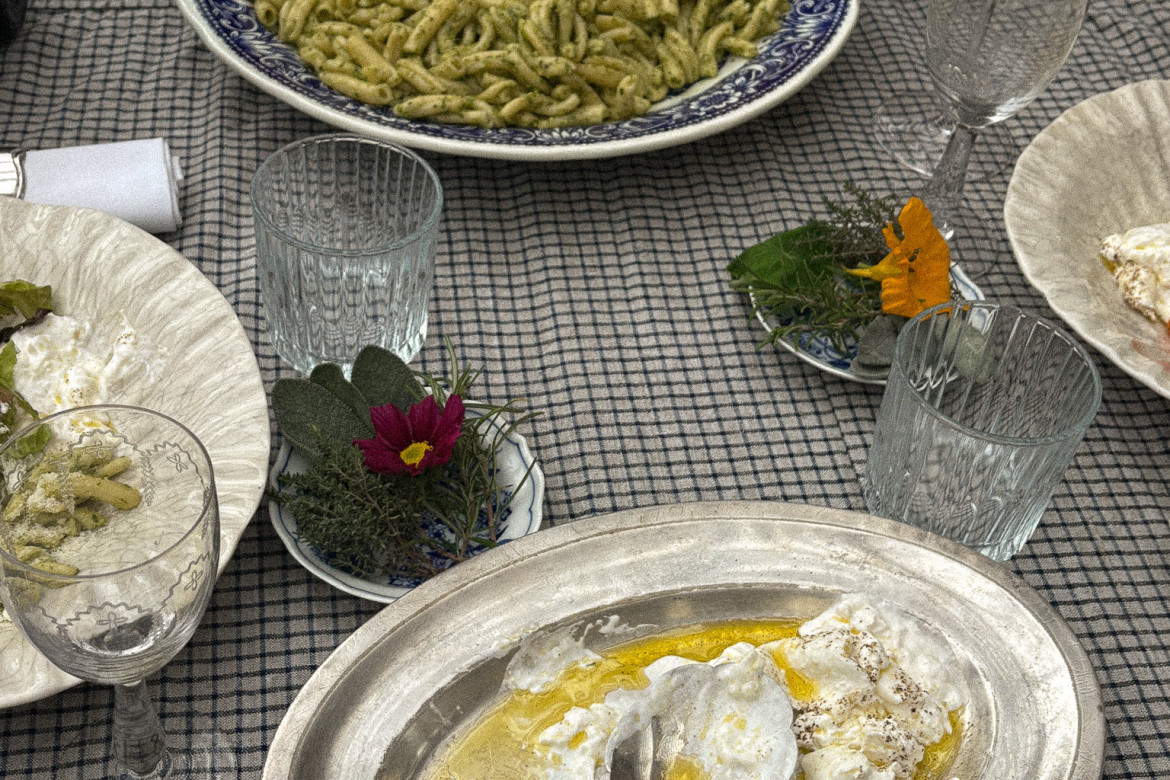 Sissi und Pat von „tables and food“ schufen gemeinsam mit der Villa Arnica im Herbst 2024 eine artistische Dining Experience, bei der die Grenzen zwischen Kunst und Cuisine verschwammen. Mit 50 cm langen Grissini, Ziegenkäse in Form von Cocktailtomaten und einzigartigem Geschirr verwandelten sich Tischgedecke in Skulpturen. Gäste aus Paris, London und Mailand versammelten sich am Wochenende um die elegant gedeckte Tavolata im Glashaus, in der Stube und im Flur der antiken Villa.